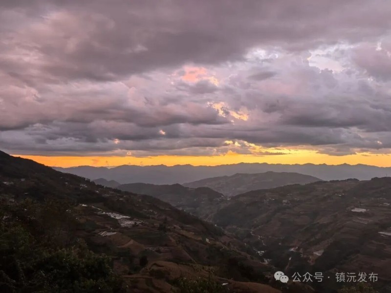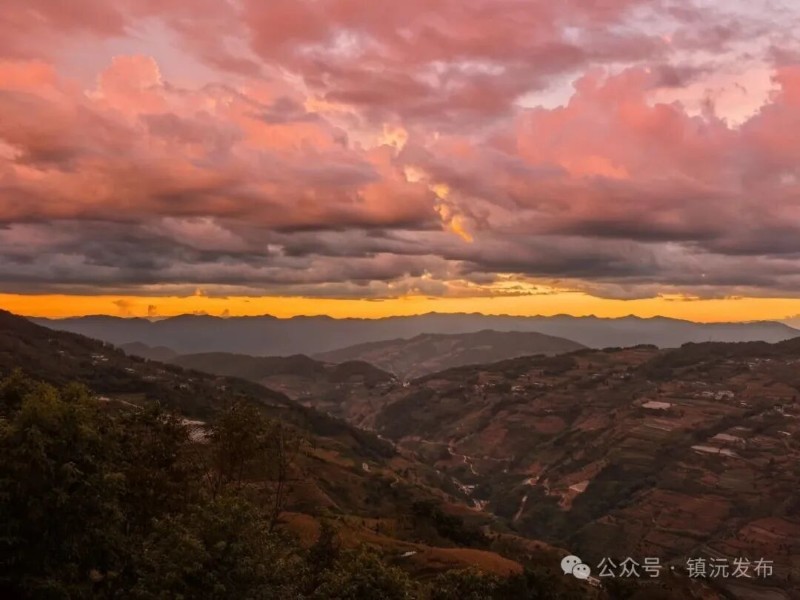 天空中,大片云朵被夕陽(yáng)染上粉紅、粉藍(lán)等暖色調(diào),云層邊緣還透著金黃霞光,仿佛一條金色的河流,與暗調(diào)山巒形成鮮明對(duì)比。山間的村落、梯田安靜地臥在山的懷抱里,接受著暮色的輕撫,仿佛世間紛擾都被隔絕在外,只剩這片刻的寧?kù)o與美好。