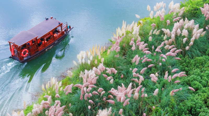 雙甲山碼頭是普者黑蘆葦最密集的區(qū)域,每年的9月至11月,一叢叢蘆葦連綿不絕,像是給大地鋪上了一層柔軟的絨毯,微風(fēng)拂過,粉白交織的蘆葦蕩掀起層層柔軟的波浪,想要抓住秋日精華,一定要體驗一番乘古風(fēng)船賞蘆葦,船槳攪碎倒影,蘆葦在兩岸輕輕搖曳,仿佛穿越進水墨畫卷里。