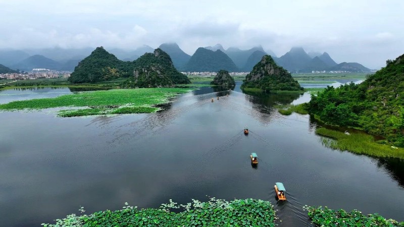 透過蘆花,不遠處是西荒濕地,錯落矗立的喀斯特孤峰,換乘竹筏穿行其間,又是另一番景象,賞巖溶濕地,游候鳥天堂,玩轉(zhuǎn)水墨仙境,闖入喀斯特詩意畫框,這一刻才算真正讀懂普者黑的山水之美。