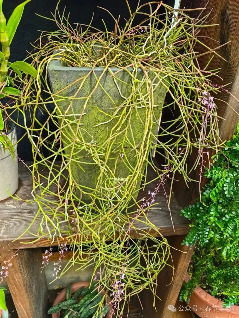 植株通常懸垂。莖細(xì)圓柱形,長達(dá)70厘米,粗3-4毫米,分枝或不分枝,具多數(shù)互生的葉,節(jié)間長1-2.5厘米。葉肉質(zhì),圓柱形,伸直或稍弧曲,通常長6-10厘米,粗2-3毫米,先端稍鈍,基部具關(guān)節(jié)和抱莖的葉鞘。