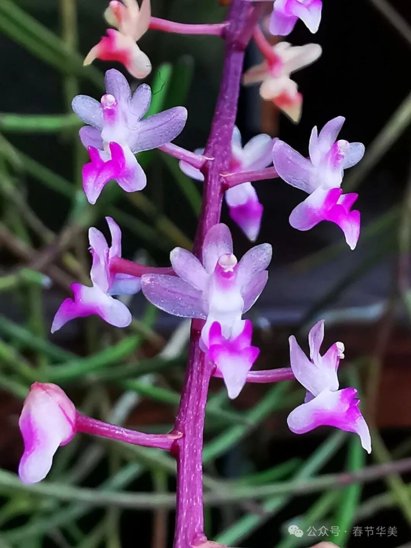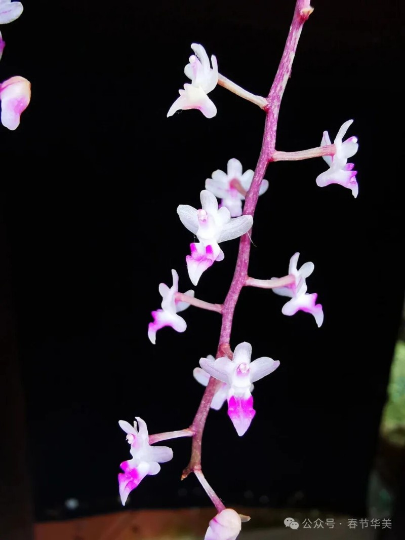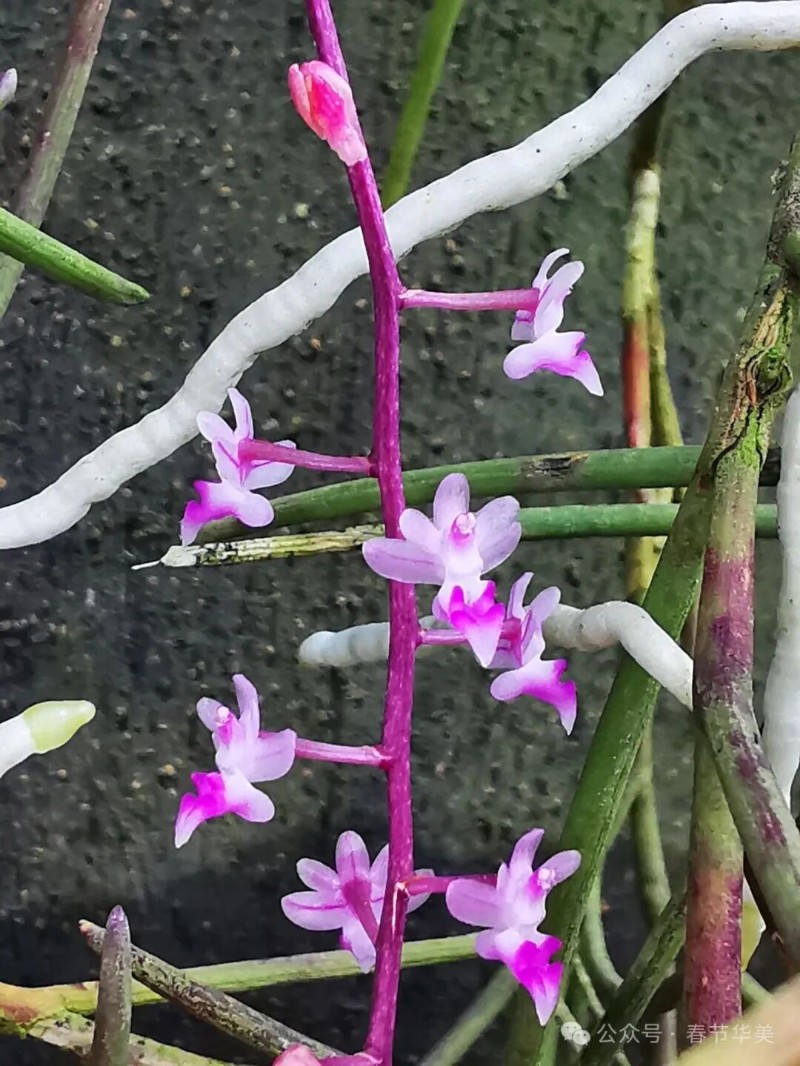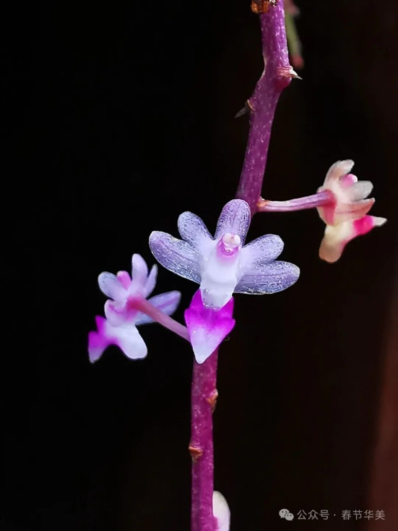 花序側(cè)生,斜出,比葉長,通常分枝,花序柄基部具2-3枚短鞘,花序軸纖細(xì),總狀花序或圓錐花序密生許多小花;花苞片小,卵狀披針形,長約2毫米,先端急尖呈鉆狀;花梗和子房纖細(xì),長5毫米;花粉紅色,開放;中萼片卵狀橢圓形,舟狀,長2.2毫米,寬約1.5毫米,先端圓形,具3條脈;側(cè)萼片斜卵狀橢圓形,長2.5毫米,寬1.5毫米,基部貼生在蕊柱足上,先端鈍,具3條脈;花瓣長圓形,長2.2毫米,寬1毫米,先端鈍,具1條脈;唇瓣深紫紅色,3裂;側(cè)裂片直立,舌狀長圓形,向前伸,先端鈍,兩側(cè)邊緣多少內(nèi)折;中裂片肉質(zhì),狹卵狀三角形,上面中央具1條縱向的脊突,脊突位于距口前方隆起呈三角形;距球形,兩側(cè)稍壓扁,粗約2毫米,末端凹入,具不明顯的隔膜,內(nèi)側(cè)背壁上方的胼胝體呈T字形3裂,其側(cè)裂片近角狀,短于或幾乎等長于中裂片而稍向下彎曲;中裂片較粗壯,基部2淺裂并且密布乳突狀毛;蕊柱長2毫米,具長約2毫米的蕊柱足;蕊柱翅在蕊柱上端兩側(cè)各具1枚齒狀附屬物;藥帽前端不伸長,先端截形并且具寬的凹缺;粘盤柄寬卵狀三角形或鐘形,粘盤近新月形?;ㄆ?-6月。