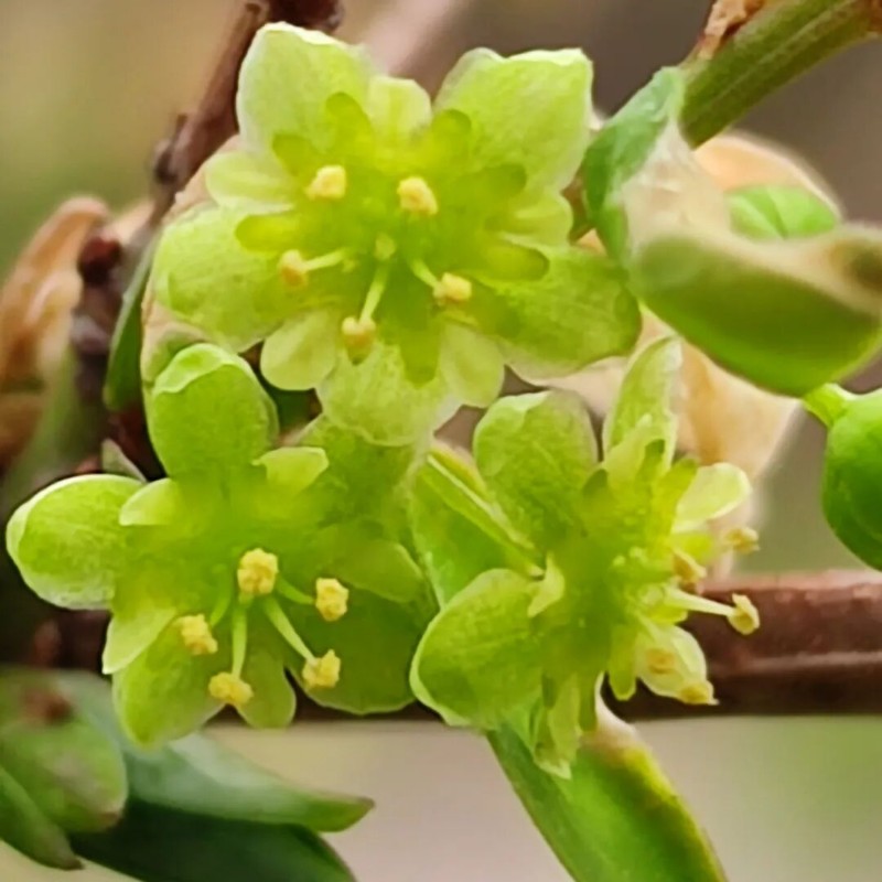 和重陽木一樣,雀兒舌頭也有雌花和雄花,不過前者是雌雄異株而后者同株。通常單生或2-4朵簇生于葉腋處,花萼和花瓣都是綠色,萼片比花瓣大一些。雄花的花蕊有5個,花絲與花瓣近乎同色,花藥黃色;雌花有3個花柱并在一起,每個花柱2深裂。很可惜的是,我竟然沒有注意到雌花。