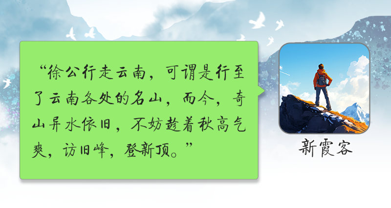 編者按:約400年前,走遍大半個(gè)中國的徐霞客在云南忽然放慢腳步,在山水間解鎖悠然模式,并留下了25萬字的《滇游日記》,為“有一種叫云南的生活”寫下最早的注腳……走他走的路、吹他吹過的風(fēng),作為新霞客旅居云南的你,是否也會(huì)驚嘆于云南的獨(dú)特魅力,是否也會(huì)遺憾于徐霞客不曾看到的云嶺新景。而今日之云南又與往日之滇景,有哪些不同?不妨通過一段古今對(duì)話,共同探尋云南穿越時(shí)空的魅力、亙古綿長的文化和煥發(fā)新生的活力。