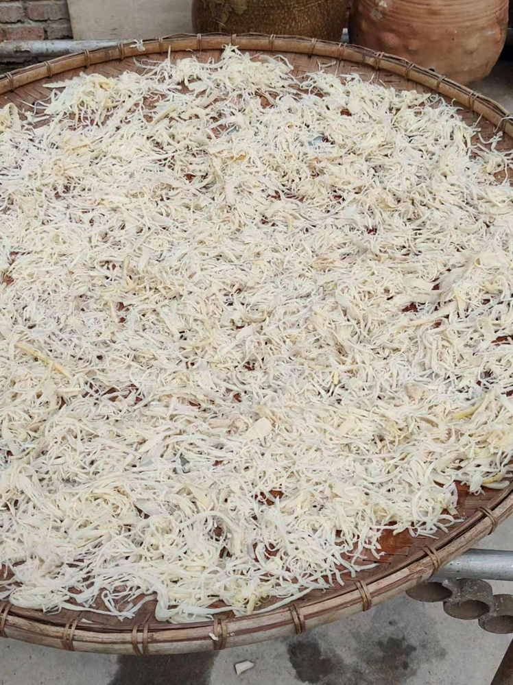 干酸筍(糯佑)制作:將發(fā)酵好的鮮酸筍煮熟,曬干后制成干品,方便長期儲存。食用時,取一把干酸筍放入碗中,加少許鹽和辣椒面,沖入沸水即可。