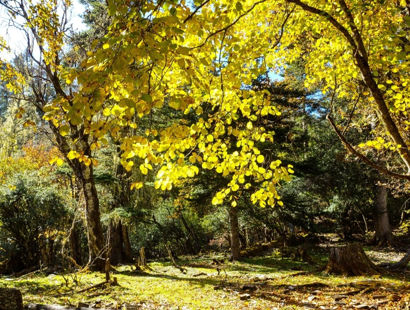 山路像條蜿蜒的絲帶,牽著人往高處走。每一步都踩著不同的色彩:前一腳是楓葉的紅,后一腳便踏入樺樹的黃,轉(zhuǎn)角處撞見松針的綠,偶爾還有未褪盡的淺褐蕨類,在石縫里探頭探腦。山腰的灌木結(jié)著紅果,像一串串小燈籠,掛在斑斕的枝葉間,引得山雀飛來啄食,啾啾聲驚起幾片落葉,在空中劃出優(yōu)美的弧線。
