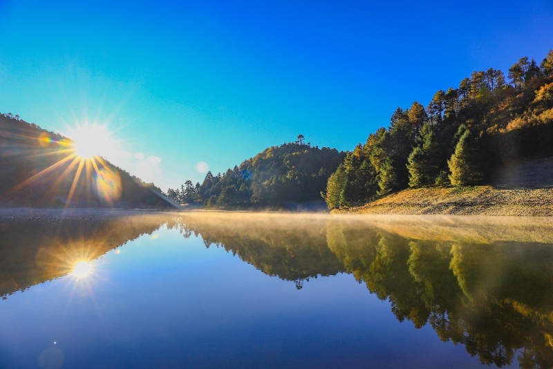 晨霧尚未散盡時,山腳下的楓葉已搶先紅透。不是那種灼眼的艷,是浸了晨露的紅,像被陽光吻過的胭脂,順著葉脈慢慢暈開。風(fēng)過時,楓葉打著旋兒飄落,鋪在石階上,踩上去有“沙沙”的輕響,像大地在耳邊低語。再往上走,樺樹的黃撞入眼簾,樹干是筆挺的白,葉子卻黃得透亮,像誰把碎金撒在了枝頭,陽光穿過時,滿地都是晃動的光斑。松針的綠是沉穩(wěn)的底色,一簇簇扎在枝丫間,與紅黃交織,不搶眼,卻讓整個山景有了呼吸感。