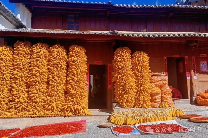 秋收時節(jié),家家戶戶屋檐下掛起了編織成串的玉米,放眼望去,金色的玉米、紅辣椒、南瓜等作物鋪滿老街,在陽光下熠熠生輝,繪就了一幅獨具特色的民俗曬秋景觀。