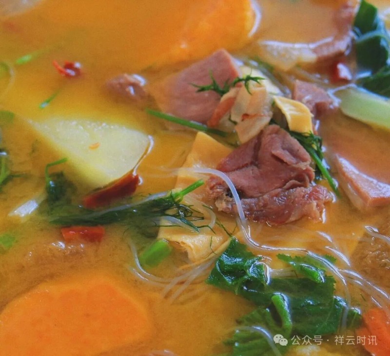 國道邊的彝家羊湯鍋選用本地黑山羊,湯色乳白、香味濃郁,肉酥而不爛、不膻不腥、濃香可口。羊皮香、羊肉鮮、羊肚脆、羊血嫩、羊蹄韌,各種口感交織在一起,讓人回味無窮。這個時候熱情的彝族同胞就會端起酒杯唱起祝酒歌,祝福遠方來的客人。