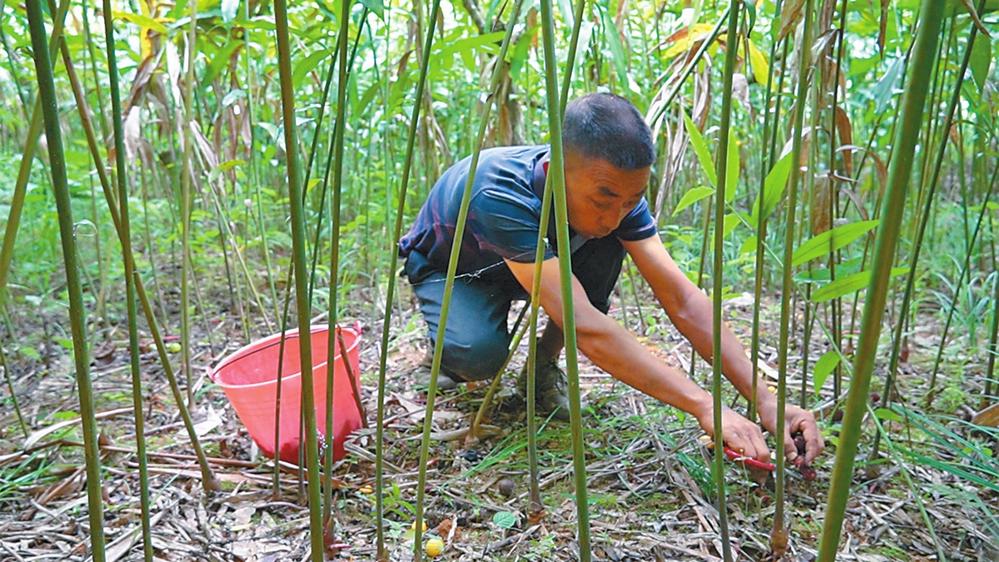 種植戶胡廷富正在采收砂仁。 本報通訊員 徐婉溶 攝