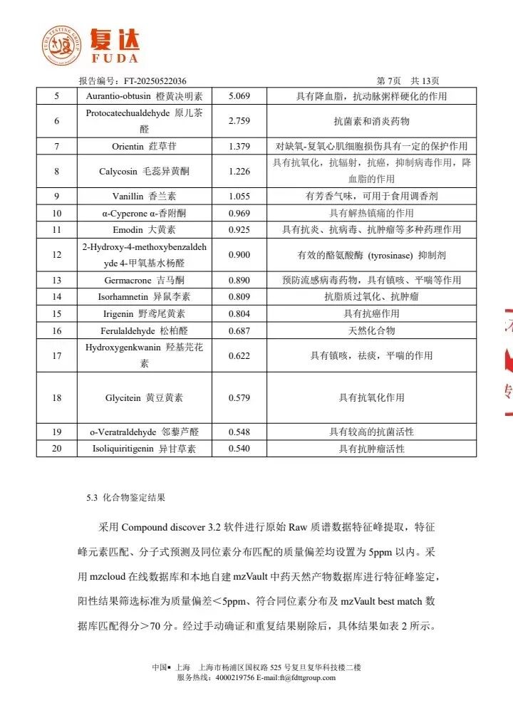 橙黃決明素(5.069%)具有降血脂,抗動脈粥樣硬化的作用?;怏w內(nèi)痰濁瘀滯,調(diào)節(jié)氣血,改善機體免疫機能。