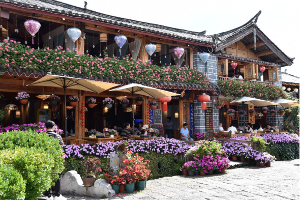 進(jìn)入9月,中秋的清輝與國慶的紅韻撞個滿懷,麗江這座滇西北的古城便迎來了一年中最富詩意的時節(jié)。清晨的玉龍雪山,晨霧如輕紗般漸褪,露出圣潔的峰頂,積雪在秋日暖陽里折射出細(xì)碎的鎏金,像給山尖綴了層溫柔的星光。在麗江古城,街巷早已被菊花鋪滿,緋紅的、明黃的、淡紫的、粉白的花朵,或綴在斑駁的墻頭,或依著青石板石階,風(fēng)一吹便漾起輕輕的花浪。兩側(cè)納西族風(fēng)格的民居前,五星紅旗隨風(fēng)飄揚(yáng),鮮紅的色彩襯著黛色瓦檐,把節(jié)日的熱鬧揉進(jìn)了古城的溫婉里。