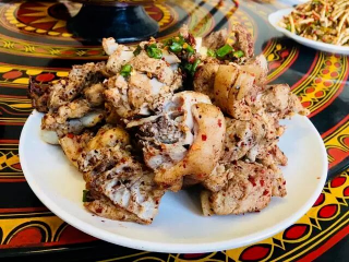 寧蒗坨坨肉:坨坨肉是一道彝族的傳統(tǒng)美食,因其每一塊肉的重量均在二三兩上下,成“坨”狀,故名。彝家人吃肉常以大塊肉為快,通過精心烹調(diào)后食用。趁肉熱時拌以食鹽,使肉入味。坨坨肉味醇厚、肉質(zhì)細(xì)嫩且鮮美、脆而不綿、肥而不膩,頗有民族之味。