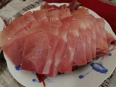 三川火腿:三川火腿的制作,是選取臘月豬的豬腿,精心修飾成琵琶狀,然后涂抹數(shù)輪高度白酒與食鹽,腌制一個月。出缸之后,用白皮紙粘封開口無皮之處,接著把火腿置于通風(fēng)陰涼的地方晾掛約3個月。隨后,將火腿放入竹囤簍,用篩過的細(xì)密灶灰把火腿深深掩埋并壓實(shí),這樣做是為了進(jìn)一步吸收火腿中的潮氣,使其與外界隔絕,如此儲存陳化半年以上。灶灰存放的時間越久,火腿的水分就越少,肉質(zhì)越顯精干,香氣愈發(fā)濃郁,味道也更加醇厚。切開三川火腿,可見其色澤鮮紅、通透油潤,香氣彌漫滿屋。它可以直接生吃,瘦肉不柴、肥肉不膩,豬皮易于咀嚼,咸度恰到好處,十分可口。