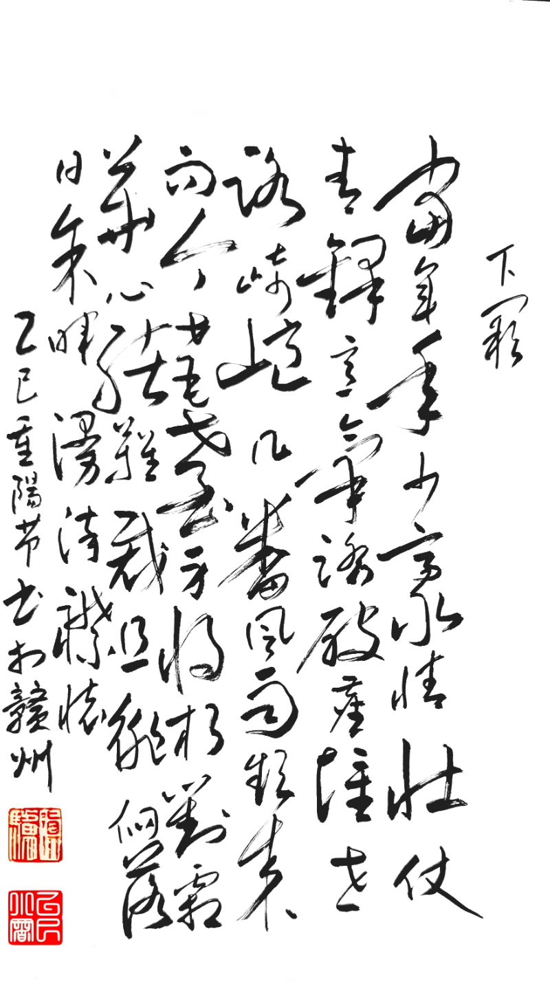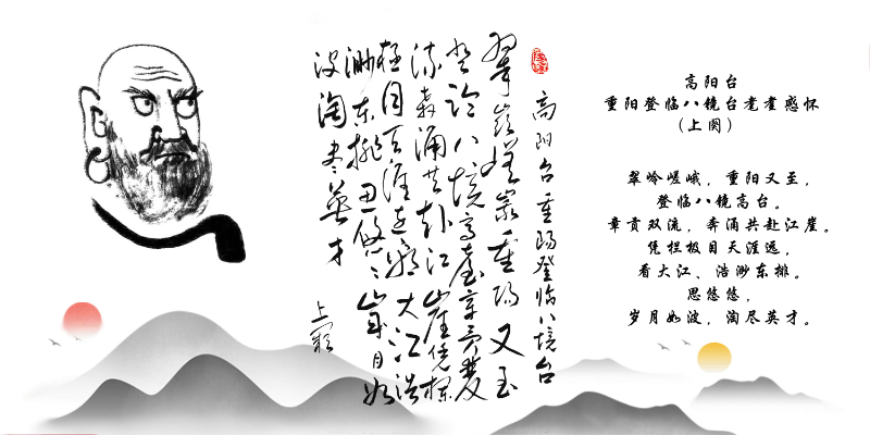 翠嶺嵯峨,重陽又至,登臨八鏡高臺。章貢雙流,奔涌共赴江崖。憑欄極目天涯遠,看大江、浩渺東排。思悠悠,歲月如波,淘盡英才。