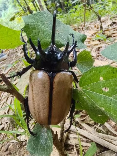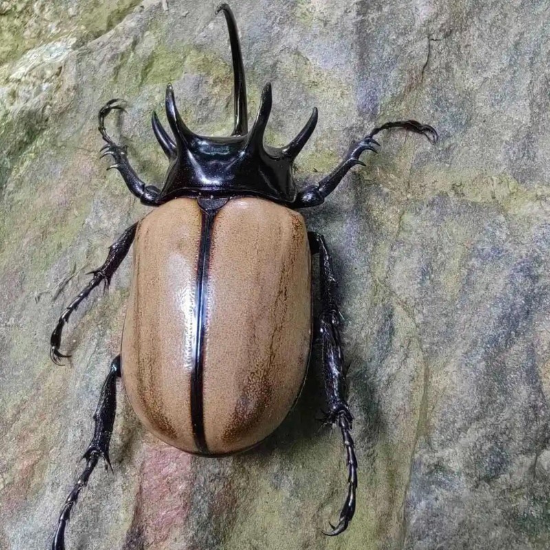 細角疣犀金龜又稱五角大兜蟲,體長50毫米—55毫米,寬26毫米—28毫米。雄蟲背面隆拱,深棕褐色,觸角10節(jié),前胸背板甚隆拱,有前指強大的角突2對。雌蟲無角突,體型略小于雄蟲。以腐木和腐殖土為食,能促進其分解,在森林物質(zhì)循環(huán)中具有重要作用,多棲息于森林環(huán)境中。主要分布于云南、廣西等地。