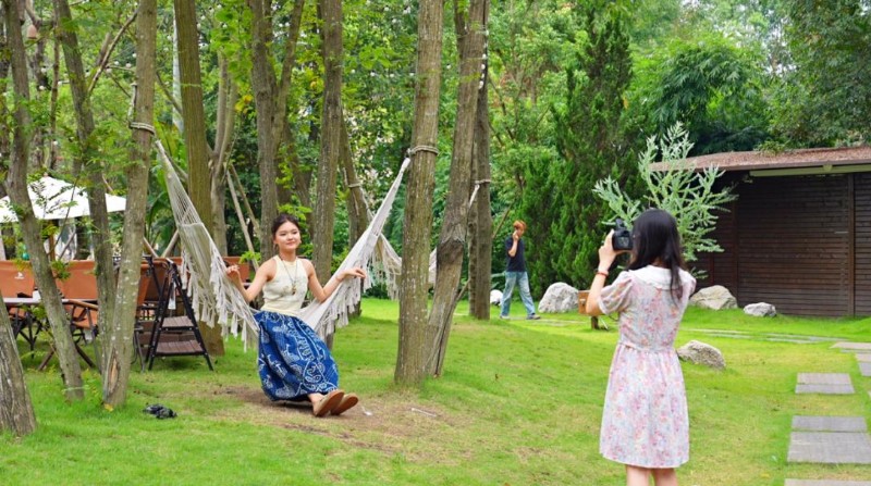 位于團(tuán)結(jié)街道香脂湖公園旁的“福氣森林”,便是郫都露營經(jīng)濟(jì)的代表。走進(jìn)福氣森林,繁茂的樹木與潺潺溪流構(gòu)成“世外桃源”般的景致。白色帳篷錯(cuò)落分布在草坪上,搭配東南亞風(fēng)格懶人沙發(fā),隨手一拍便是“異國度假風(fēng)”。《鈴芽之旅》同款“時(shí)空之門”更是打卡熱門,陽光透過樹葉灑在門上,光影交織間仿佛穿越次元。在這里,游客可遠(yuǎn)離城市喧囂,沉浸式享受自然之美。