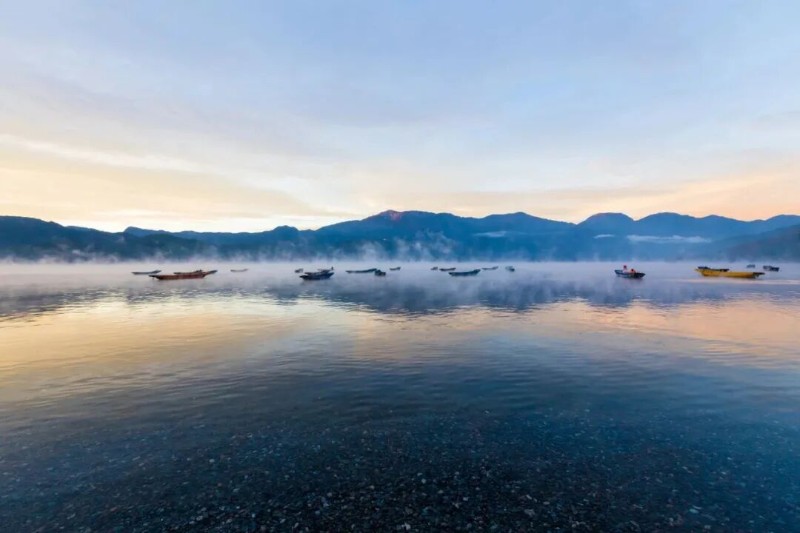 當(dāng)瀘沽湖還在沉睡時(shí),湖面已經(jīng)開始慢慢蘇醒,一絲絲薄霧從水面上升起,如輕煙、似白紗,越來(lái)越濃,越來(lái)越厚,慢慢地匯成了一片乳白色的霧海。