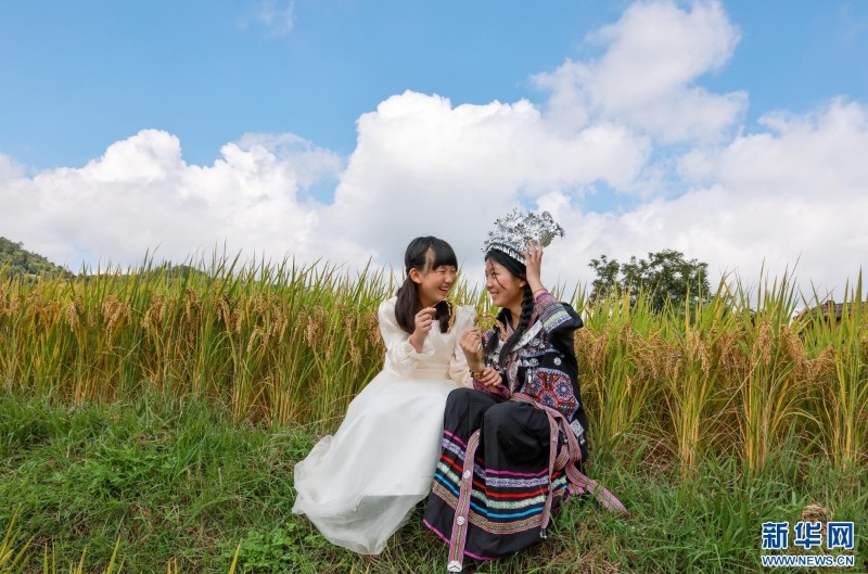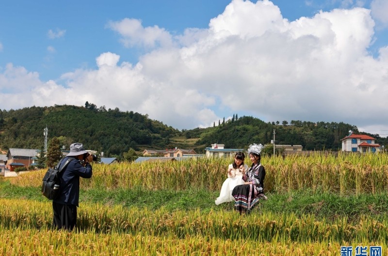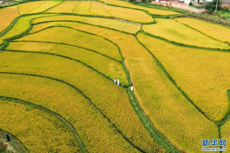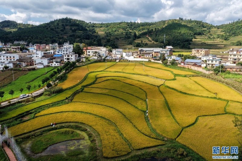 秋日里,云南省曲靖市沾益區(qū)龍華街道紅瓦房村,稻浪層層翻滾,在陽光照耀下泛起金光??罩懈╊?,田埂縱橫交錯,勾勒出優(yōu)美的線條,吸引游客前來游玩欣賞,放松休閑。圖為稻浪層層翻滾,在陽光照耀下泛起金光(10月5日攝)。新華網(wǎng)發(fā)(孫文來 攝)