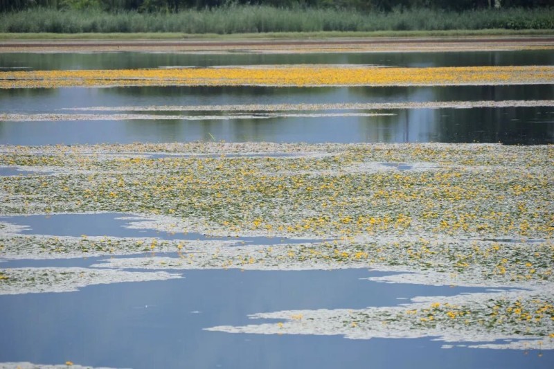 秋風(fēng)為西草海鍍上琥珀色。荷塘褪去熱烈,蘆葦舉起雪白的花穗,荇菜在水面依舊開得燦爛熱烈,道路兩旁的樹木也被染得金黃,樹葉在風(fēng)中輕輕搖曳。傍晚時分,落日為水面灑下碎金,候鳥飛翔的剪影掠過天際,滿是靜謐的詩意。