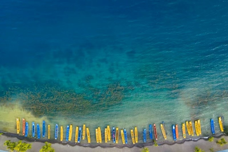 從空中俯瞰,瀘沽湖宛如一塊巨大的藍(lán)寶石鑲嵌在群山之間,蜿蜒的湖岸勾勒出優(yōu)美的弧度,而湖畔的花海像是一條彩色的錦帶,為這顆“藍(lán)寶石”鑲上了最亮麗的花邊。遠(yuǎn)處的村落炊煙裊裊,豬槽船在水面輕輕劃過,構(gòu)成了一幅人與自然和諧共生的寧靜畫面。