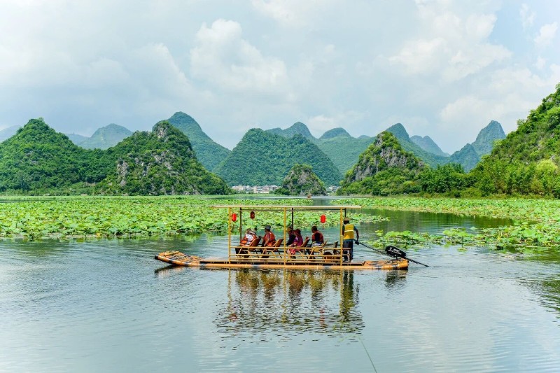 透過蘆花,不遠處是西荒濕地、錯落矗立的喀斯特孤峰,換乘竹筏穿行其間,又是另一番景象。賞巖溶濕地,游候鳥天堂,玩轉(zhuǎn)水墨仙境,闖入喀斯特詩意畫框,這一刻才算真正讀懂普者黑的山水之美。