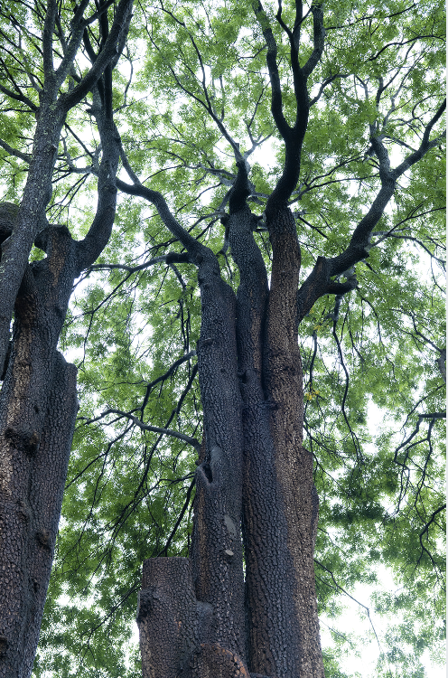 黃連木赭褐樹皮鱗裂如甲,根系深扎紅土地,枝冠蒼勁成巨傘;春吐紫紅新芽,秋燃金橙華彩,與紅土墻、藍天相映成畫。