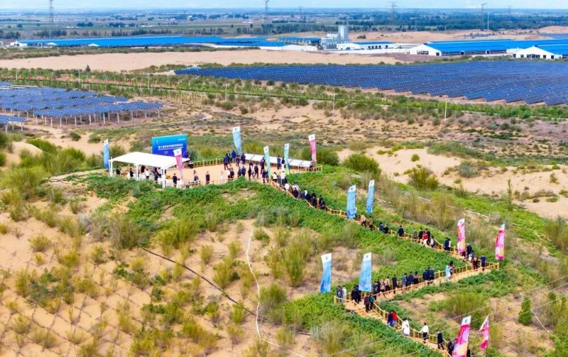 9月16日,第十屆庫(kù)布其國(guó)際沙漠論壇與會(huì)者參觀庫(kù)布其沙漠鄂爾多斯中北部新能源基地先導(dǎo)工程(無人機(jī)照片)。(王正 攝)