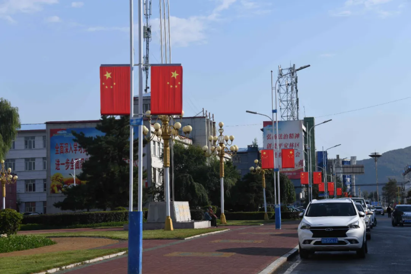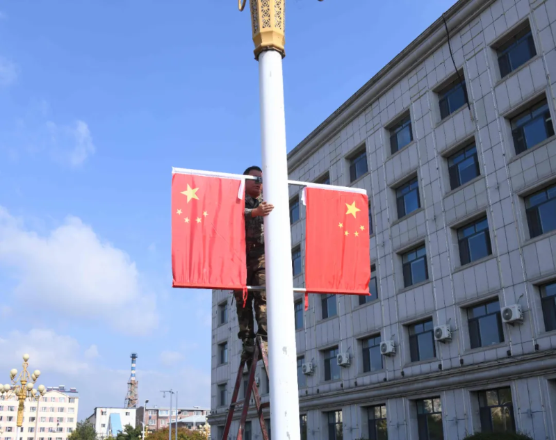 9 月 29日起,布置工作全面展開。工作人員將國旗固定在主要街道及廣場四周的燈柱上,從街頭延伸至街尾,形成一條 “紅色長廊”。紅色旗幟與廣場內(nèi)的綠植、宣傳欄相映成趣,成為林區(qū)秋日里最動人的風(fēng)景。