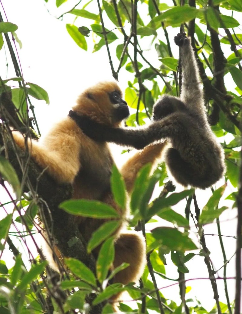 這些“樹冠精靈”雌雄異色,雄性身披黑亮毛發(fā),雌性身著金黃“衣袍”,無尾和長臂的特征是它們穿梭林間的“生存利器”。紅外相機記錄下它們的靈動日常:或獨自在樹冠間穿梭,或拖家?guī)Э趧澇鰞?yōu)美弧線,能在復(fù)雜密林里精準(zhǔn)定位果樹,每日循著食源在林間暢快活動。從1986年的50多只,到如今的600余只,種群數(shù)量的穩(wěn)定增長,是景東生態(tài)保護最直觀的“勛章”。