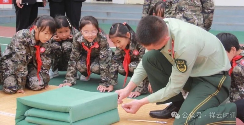 操場上的體驗(yàn)環(huán)節(jié),武警部隊(duì)官兵向同學(xué)們展示疊軍被的步驟,幫助同學(xué)們現(xiàn)場完成“疊豆腐塊”。