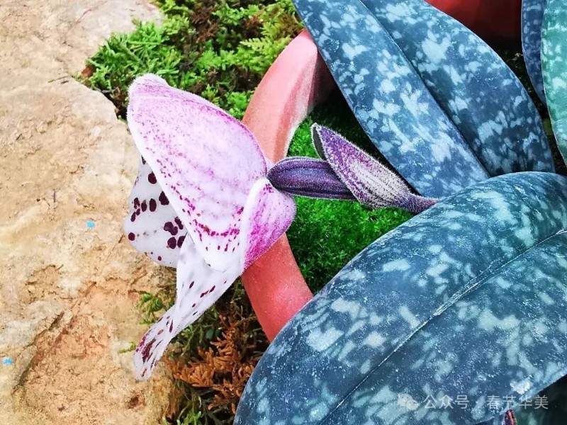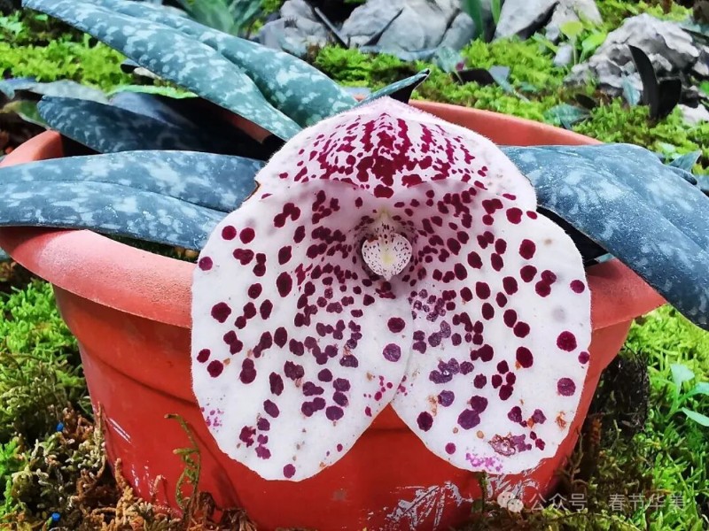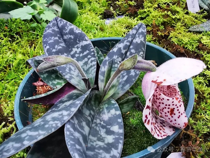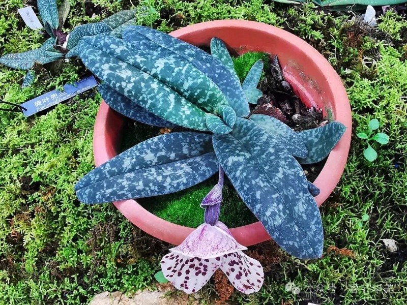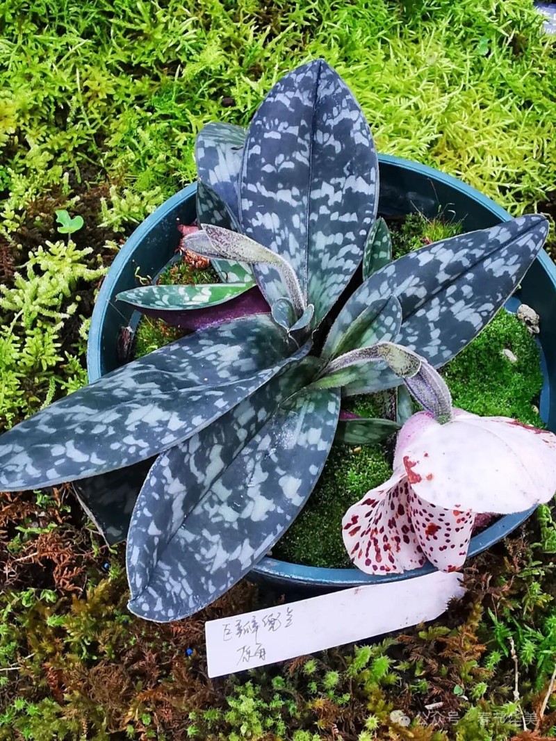 地生或半附生植物,通常較矮小。葉基生,二列,4—5枚;葉片狹橢圓形或長圓狀橢圓形,先端鈍并有不對稱的裂口,上面有深淺綠色相間的網(wǎng)格斑,背面密布紫色斑點,中脈在背面略呈龍骨狀突起,基部略收狹成柄并對折而互相套疊。