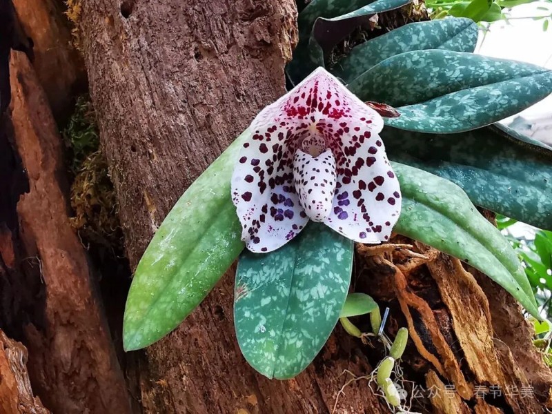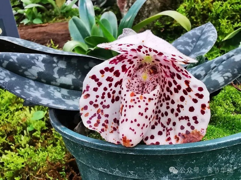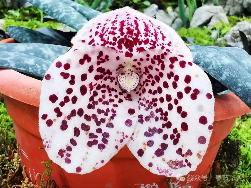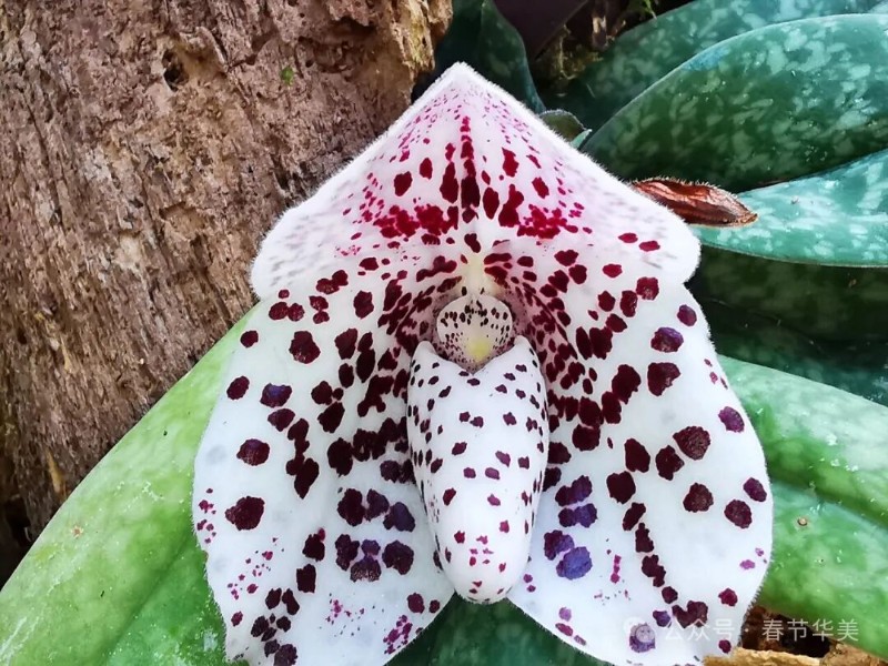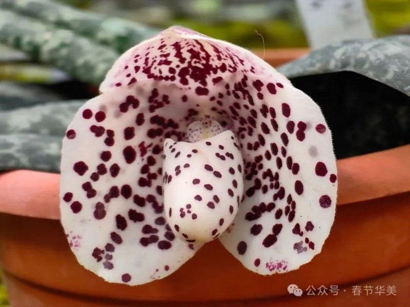花葶直立,很短,紫褐色,被長柔毛,頂端生1花;花直徑6—7厘米,白色或帶淡黃色,具紫紅色或紫褐色粗斑點,僅退化雄蕊上的斑點較細;花苞片卵形,中萼片橫橢圓形至寬卵形,合萼片明顯小于中萼片,花瓣巨大,寬橢圓形或?qū)捖褷顧E圓形,邊緣有細緣毛;唇瓣深囊狀,橢圓形,有時向末端稍變狹,基部具很短的爪,囊口寬闊,整個邊緣內(nèi)彎,但前方內(nèi)彎邊緣狹窄,囊底有毛;退化雄蕊近圓形或略帶方形,先端鈍或略有3齒。