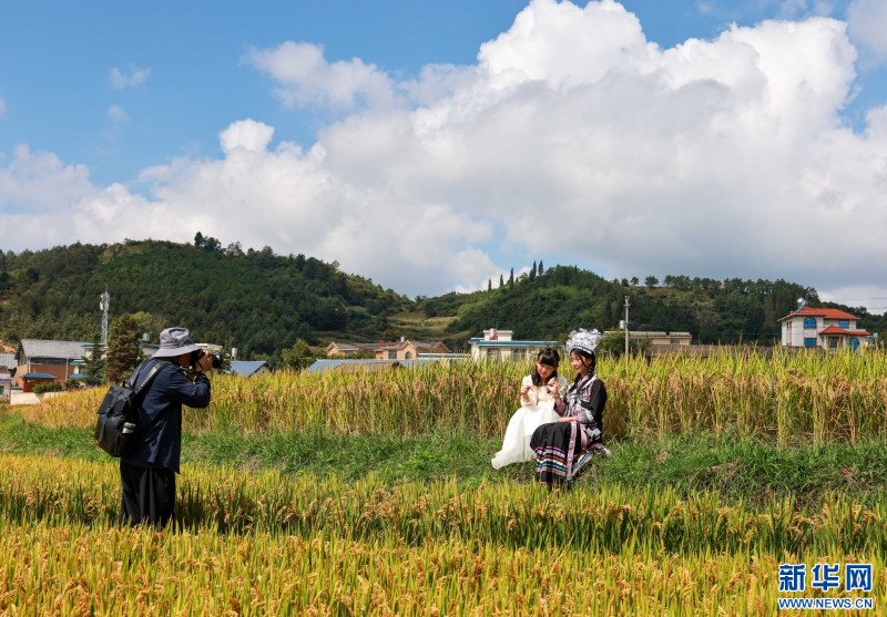 游客在稻田中游玩拍照(10月5日攝)。新華網(wǎng)發(fā)(孫文來(lái) 攝)