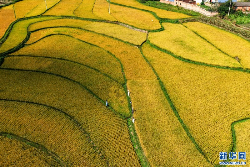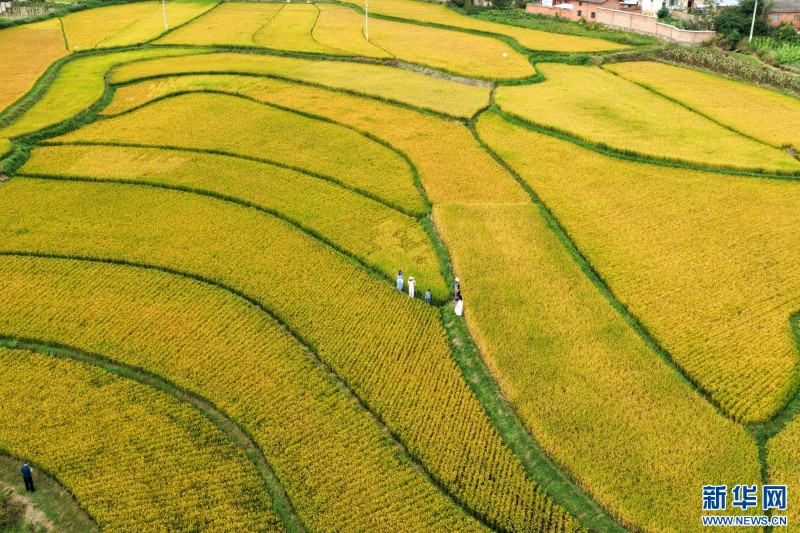 稻浪層層翻滾,在陽(yáng)光照耀下泛起金光(10月5日攝)。新華網(wǎng)發(fā)(孫文來(lái) 攝)