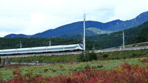 高原特有的雪風(fēng)是它們最好的伴奏。石卡雪山上陣陣松濤,夾雜著松茸的清香掠過建塘草原,狼毒花舒展腰肢隨風(fēng)搖曳,整片山坡草甸泛起一波接一波的紅色波浪。這波浪從山腳一直涌向天際,與遠方飛來的孔雀航班相遇,形成一道空中云橋,緩緩降落在金色的草原?!拔铱吹搅耍且黄咴t,想你的風(fēng)真的吹到了香格里拉!”剛從一個個隧道里穿行出來的復(fù)興號高鐵列車?yán)?,歡呼聲響成一片,緊貼著一個個車窗的一雙雙眼睛閃耀著驚奇的光芒,與一閃而過的車速比拼著瞬間的記憶,廣袤的草原上收割青稞的紅頭巾,與天上的流云交織成一幅流動的畫卷。
