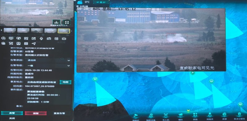 當(dāng)告警信息產(chǎn)生后,平臺(tái)開(kāi)啟了一套標(biāo)準(zhǔn)化的處置流程——所有AI識(shí)別、衛(wèi)星監(jiān)測(cè)或人工上報(bào)的告警都匯聚于指揮中心,指揮員可快速篩選指派,并通過(guò)詳情頁(yè)的圖片、視頻和精確定位進(jìn)行真火/假火研判。隨后,“實(shí)時(shí)視頻”“看向告警點(diǎn)”“周邊分析”等功能一鍵聯(lián)動(dòng),迅速調(diào)取現(xiàn)場(chǎng)畫(huà)面,分析火點(diǎn)周邊居民地、水源等關(guān)鍵要素。