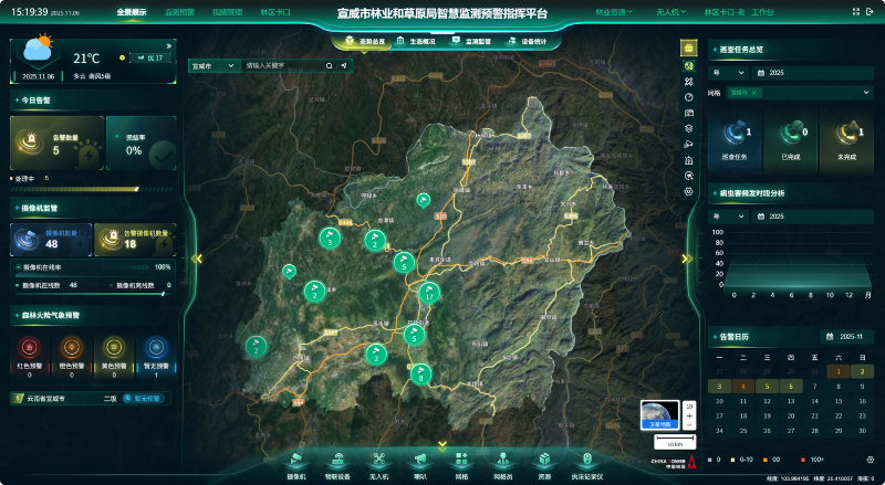 “公共基礎(chǔ)數(shù)據(jù)”“林草資源數(shù)據(jù)”“森林防火數(shù)據(jù)”和“林業(yè)綜合數(shù)據(jù)”等四大類型數(shù)據(jù)的統(tǒng)一管理展示,形成了指揮決策的“一張圖”。各類監(jiān)測(cè)設(shè)備運(yùn)行狀態(tài)、告警事件統(tǒng)計(jì)、資源分布等信息的此集中呈現(xiàn)與分析,確保了指揮決策的全面性和科學(xué)性。