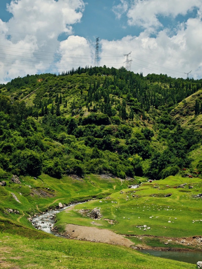 踏入洗馬池,仿佛走進(jìn)了一幅流動的油畫。春日,草甸如綠色的絨毯,從山腳鋪展到水邊,野花星星點(diǎn)點(diǎn),像是大地隨意撒落的珠寶;夏日,溪水潺潺,清澈見底,牛羊在草甸上悠然踱步,密林為這片土地添上一抹靜謐的綠;秋日,草甸漸漸染上金黃,與遠(yuǎn)處連綿的山巒、湛藍(lán)的天空構(gòu)成一幅層次豐富的畫卷;冬日,若逢雪落,整個(gè)洗馬池便成了童話世界,銀裝素裹,靜謐而純凈。在這里,仿佛置身于宮崎駿的動畫世界,每一幀都美得讓人窒息。