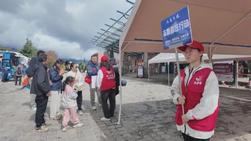 玉龍雪山景區(qū)內(nèi),志愿者為游客提供各類服務(wù)。(麗江融媒記者 高浚 攝)