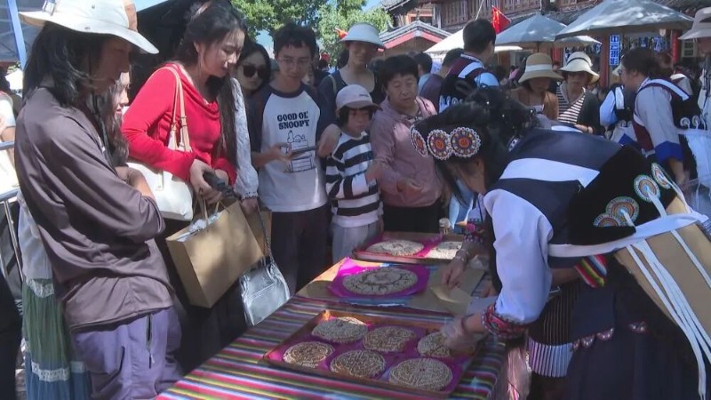 在麗江古城景區(qū),游客參與制作納西傳統(tǒng)月餅。(麗江融媒記者 木雯嬌 攝)