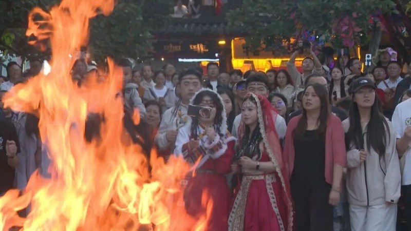 在麗江古城景區(qū)四方街,游客參與篝火打跳。(麗江融媒記者 木雯嬌 攝)