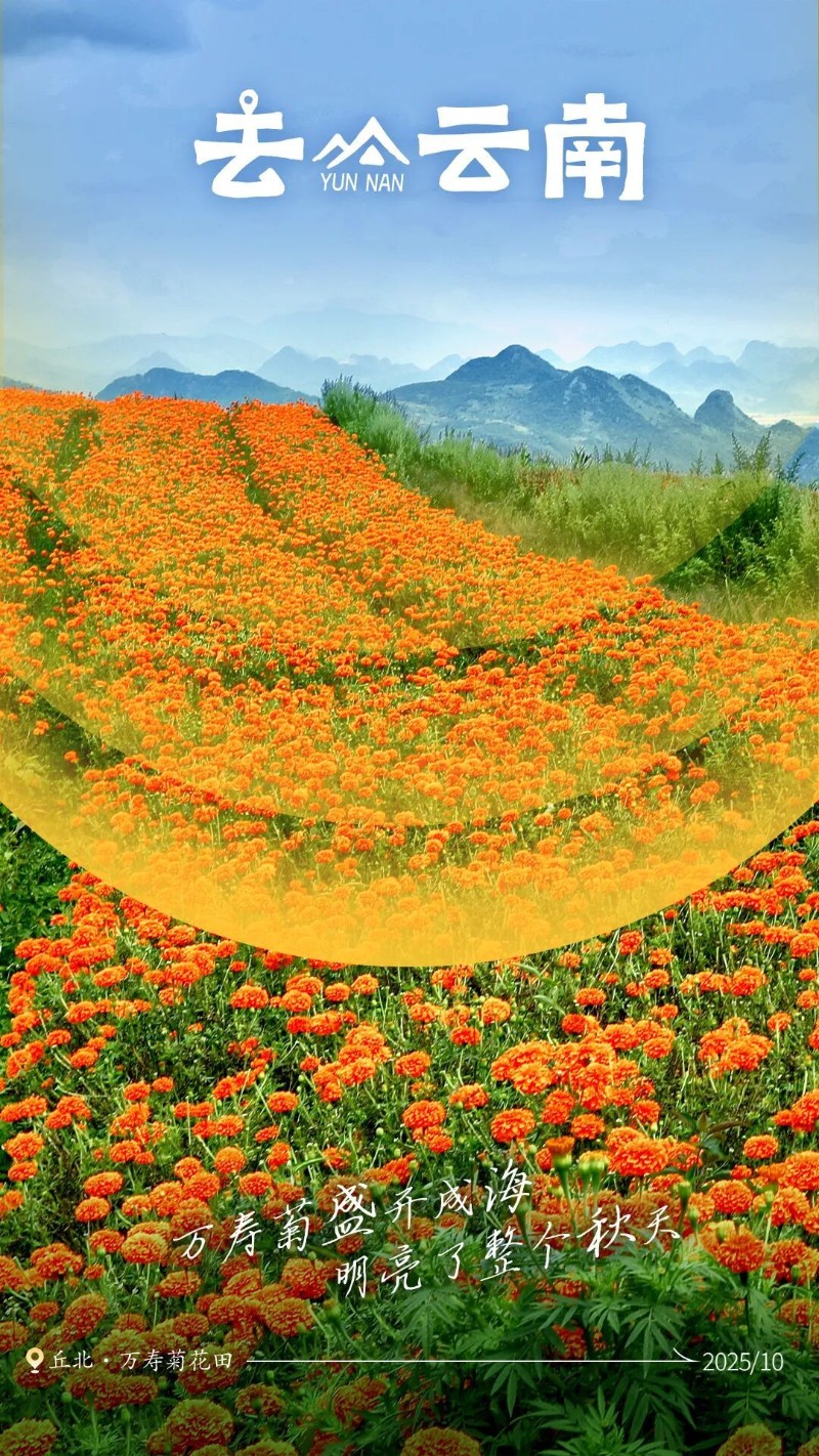 丘北的盆地、小山上,橙色的萬壽菊擠擠挨挨鋪滿了田野。明明是小小的花瓣,卻堆砌出洶涌的秋意,秋風(fēng)都難以撼動(dòng)分毫。