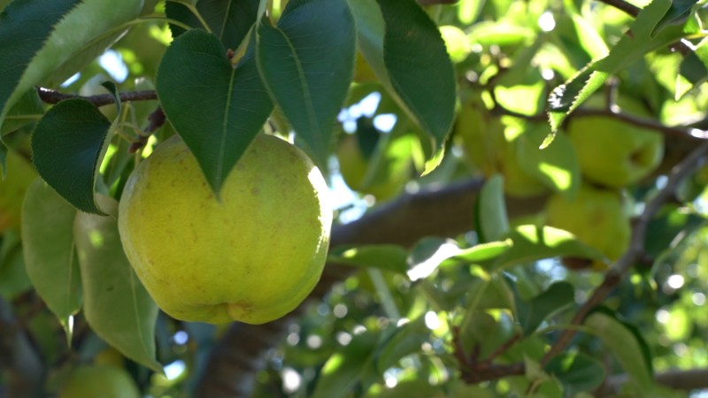 在百年老梨樹旁,鐘英村委會副主任薛建祥介紹:“我身后這幾棵老樹,不要看它不起眼,我們寶豐寺蜂糖梨都是從這個老樹上的丫枝發(fā)展起來的,它是帶動我們寶豐寺蜂糖梨產(chǎn)業(yè)發(fā)展的最古老的樹,有上百年歷史了?!?/p>