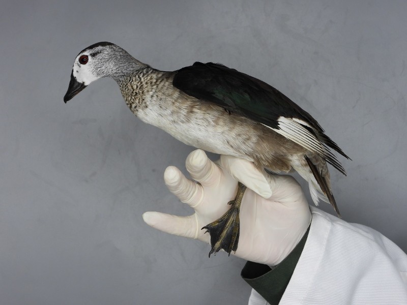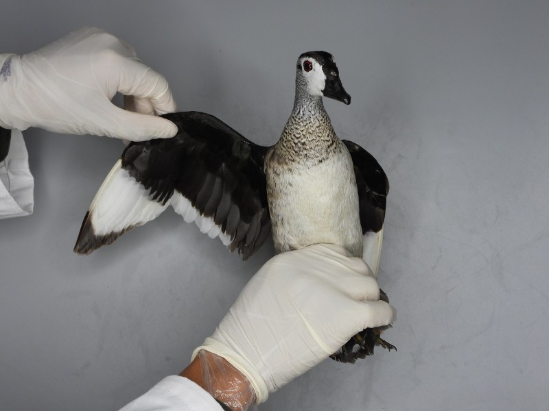 棉鳧屬于國家二級保護野生動物,是雁形目鴨科中體型最小的物種,雄鳥繁殖期頭部、頸部及下身主要呈白色,頭頂和眼部黑色,雌鳥羽色較淡,貫眼紋明顯,體長約26厘米,被譽為“世界上最小的鴨子”。棲息于江河、湖泊、水塘和沼澤地帶,成對或小群活動,善于游泳和快速飛行,主要以水生植物、水生昆蟲、軟體動物和小魚等為食。