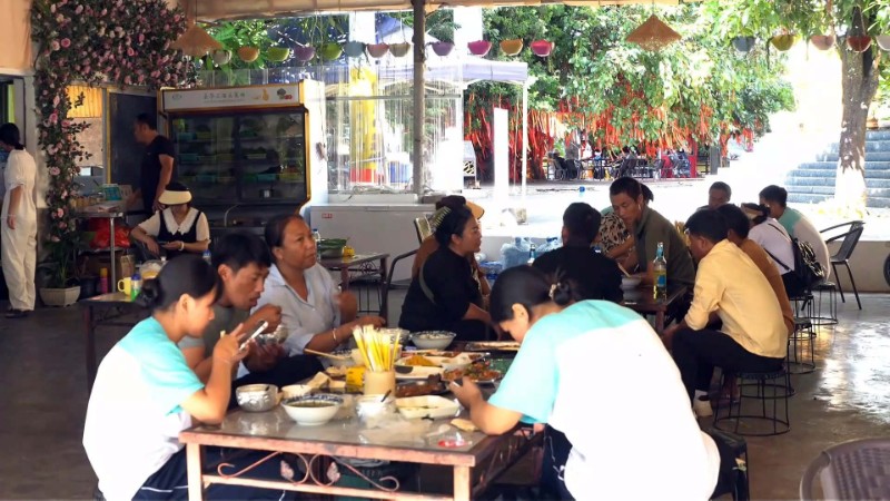 景亢景河園老村長(zhǎng)農(nóng)家樂(lè)里,傣家飯菜香撲鼻而來(lái),庭院綠植與盆景點(diǎn)綴,用餐環(huán)境雅致溫馨。老板娘張麗正穿梭在廚房和餐桌間,忙著給游客出餐。