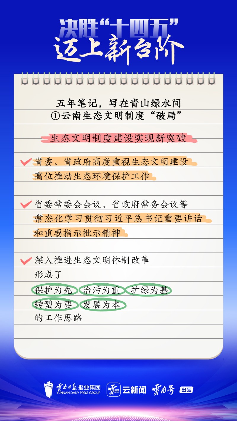 “十四五”時(shí)期,省委、省政府深入學(xué)習(xí)貫徹習(xí)近平總書記考察云南重要講話精神,始終牢記習(xí)近平總書記殷殷囑托,緊緊圍繞生態(tài)文明建設(shè)排頭兵的戰(zhàn)略定位,堅(jiān)定不移走生態(tài)優(yōu)先、節(jié)約集約、綠色低碳發(fā)展道路,全力筑牢國家西南生態(tài)安全屏障,推動(dòng)全省生態(tài)文明建設(shè)取得顯著成效。