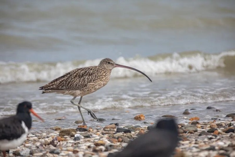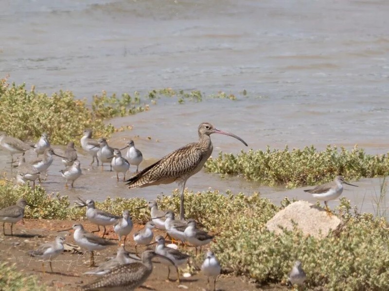 經(jīng)過了長途飛行,鳥兒們亟需好好休整一番。在灘涂上的鳥群中,大杓鷸和它那長長的彎嘴格外地顯眼。作為體型最大的鸻鷸之一,大杓鷸的行為舉止看起來有些“端莊”,與在腳邊急躁地來回奔跑的小型水鳥們形成了鮮明的對比。