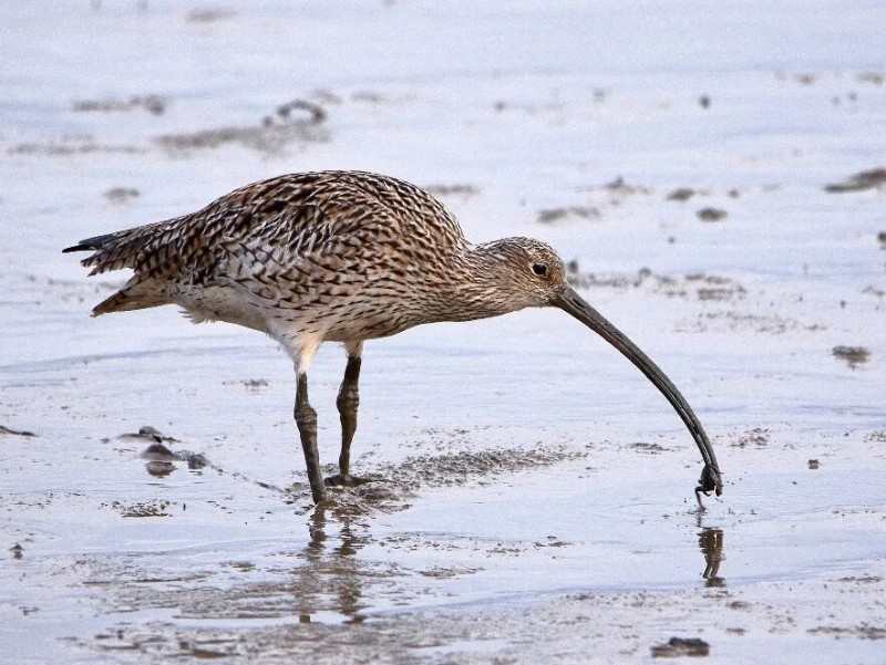 大杓鷸有著所有鸻鷸中最長的喙,而這長喙的前端又分布著大量特殊的神經(jīng)末梢,這使得它們能夠精確地找出并捕捉隱匿于泥沙中的獵物。在它們的越冬地,海蛄蝦、大眼蟹、和尚蟹等海洋無脊椎動物都是他們的最愛。