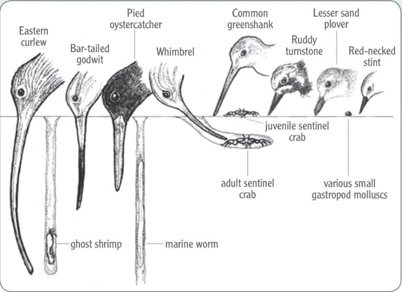 基于這一假說,水鳥與灘涂上的蝦蟹魚貝之間的共同演化可以被理解為一場漫長的“軍備競賽”——隨著獵物們要么越來越隱蔽,要么越來越機(jī)敏,獵手的覓食能力也需不斷提升。就這樣,水鳥們的喙在漫長的演化過程中特化出了千奇百怪的形狀,針對性地強(qiáng)化了自身的捕食能力。