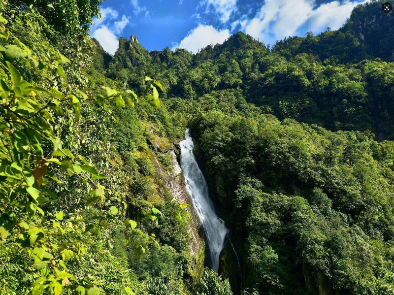 臨近山頂時,一陣轟鳴聲將我們引向遠(yuǎn)山:一道銀白瀑布如懸空白練,自原始山崖飛瀉而下。濺起的水霧如煙似塵,為山澗林木披上朦朧輕紗。